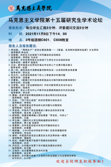 2021年11月9日,万博MAX体育官网第十五届研究生学术论坛分别在3号组团楼C601、C608教室如期举行。本次论坛旨在加强研究生的学术素养,营造浓厚的学术氛围,为研究生搭建一个高水平的学术交流平台。