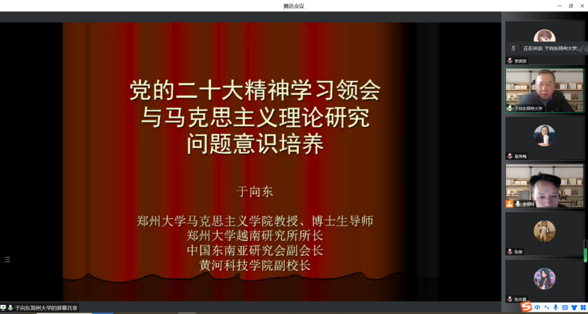 为学习贯彻党的二十大精神,加强马克思主义理论学科研究生培养,应万博MAX体育官网研究生处与万博MAX体育官网邀请,12月29日下午,郑州大学万博MAX体育官网教授、博士生导师于向东老师为万博MAX体育官网师生作主题为《党的二十大精神学习领会与马克思主义理论研究问题意识培养》的线上学术报告,万博MAX体育官网人文社科相关专业的部分教师和研究生参加,报告会由李明桂副院长主持。